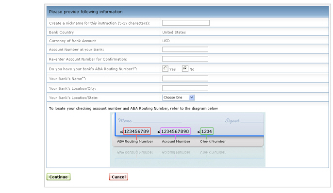 如果您有您的银行的信息,且其与屏幕上显示的银行细节不匹配,点击点击此处链接来显示一张空白表格,您能够将您的银行信息填入该表格。