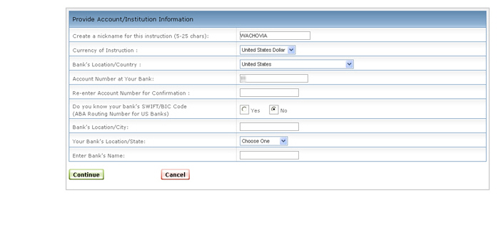 该区域只有当您在“您是否知道您的银行的SWIFT/BIC代码”区域中选择是时才会出现。 输入您的银行的ABA或SWIFT/BIC代码。 |