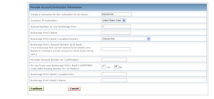 当您需要为在IB发起的ACH存款或取款使用说明时,输入将出现在来源/目的地列表(可用的银行说明列表)中的名称。昵称的长度必须在5到25个字符之间。 |