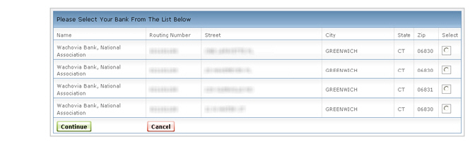 如果不止一家银行满足您输入的城市和州,您会被提示从可用的银行列表中选择。点击右方远处的单选按钮来选择想要的银行。