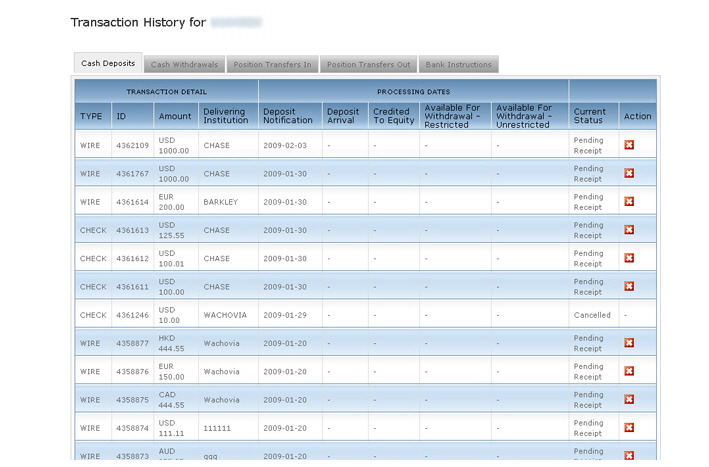 交易历史页面让您对您的账户或对您管理的客户或次级账户查看现金交易、头寸转账和银行说明。