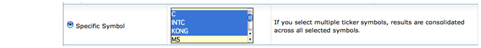 点击特定的代码来查看在选定的账户中交易的一个或多个交易代码的表现结果。账户中交易的所有代码都可用。使用Ctrl+点击键盘组合来选择多个代码。如果您选择了多个交易代码,结果在所有选定的代码中被合并。