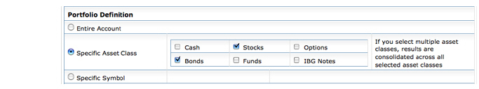 点击特定的资产类别来查看选定的账户中的一个或多个特定资产类别的表现结果。然后点击每个资产类别旁边的复选框来将其包括到您的分析中。您能够选择一个或多个现金、股票、期权、基金、债券和IBG票据。如果您选择了多个资产类别,结果在所有选定的资产类别中被合并。