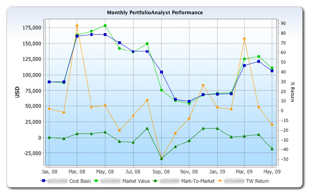 下面的图片显示了时间序列图表的一个例子。该分析使用了成本基础、市场价值和按市值计算的金额值指标以及时间加权收益率百分比值指标。注意每个指标以单独的颜色加注的线被显示的图表上。