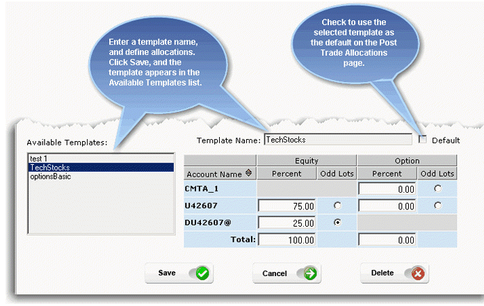 注: Select an Odd Lots recipient to which odd lot allocation amounts will be sent. The saved template will now be available in the Choose a Templates dropdown list on the Post Trade Allocations page.