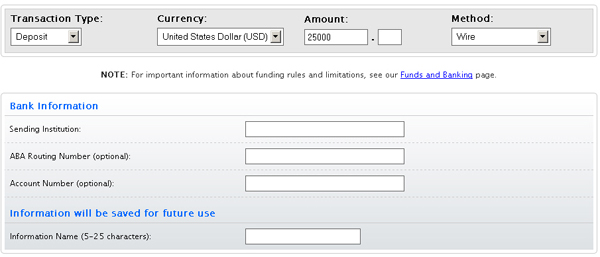 例如,下面的图示显示的是一个首次设置的电汇存款。在您选择了转账类型、货币,输入了转账数额和选择了方法后,将提示您输入您的银行信息,包括即将保存的银行指令名称。