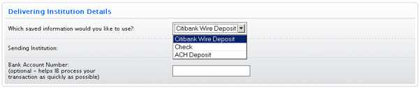 一旦您的转账请求被提交后,您输入的银行信息即被保存为银行指令。下一次您设置一个注资转账并完成前4个区域(转账类型、货币、金额和方法),您将被提示使用一个已保存的银行指令,如下所示。