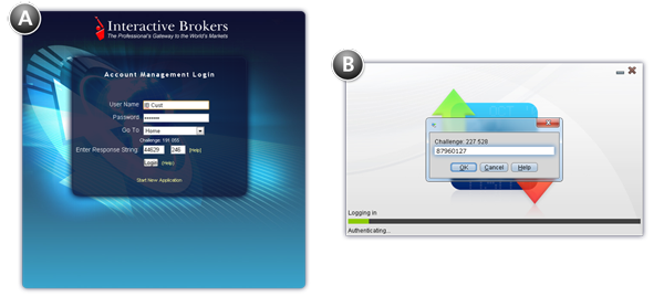 安全代码区域的呈现形式将根据您登录的应用程序略有不同。下面"A"显示的是账户管理登录。"B"显示的是TWS登录。