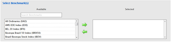 从可用的基准报告列表中选取最多三个基准,然后点击右箭头按钮将它们移入到选取的列表中。使用Ctrl+点击键盘组合选择一个或多个基准。将基准从选取的列表中移出,选择它们然后点击左箭头按钮。