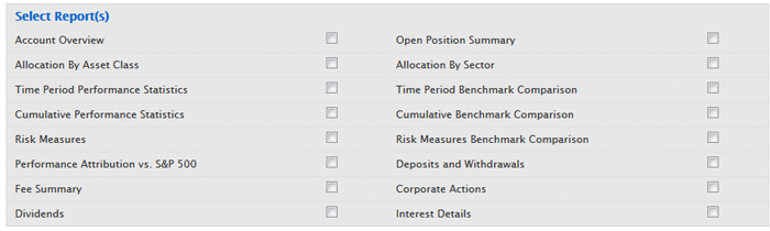 1. 每个选取账户的详细的PDF报告可以包括下列不同的报告。点击复选框来包括该报告。注意,这一部分不包括在简略报告中。