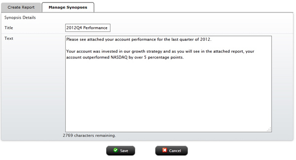 机构账户主用户(顾问主用户、经纪商主用户、基金投资经理和自营交易机构主用户)能够创建和保存文字信函概要,并将其附加到投资组合分析报告中。