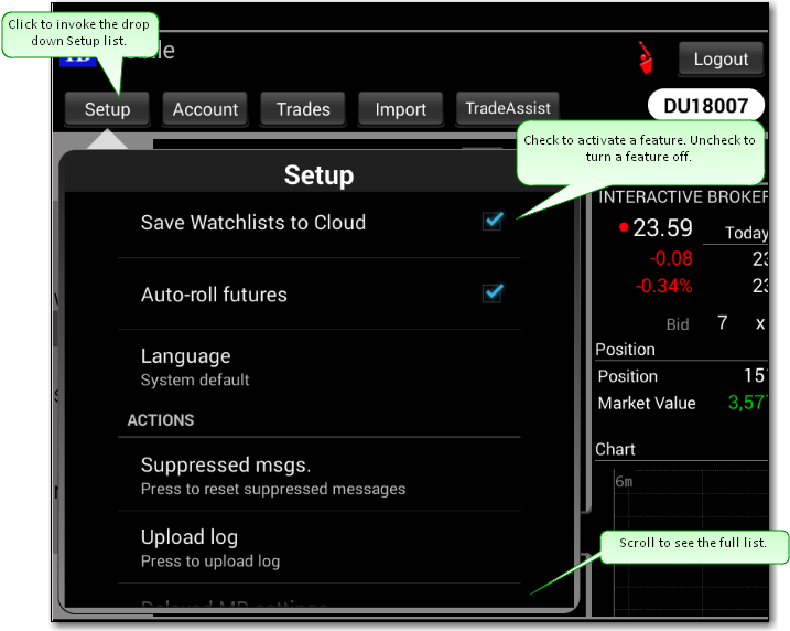 点击设置(Setup)快速进入按钮编辑移动TWS的配置设置。退出设置,点击设置面板以外的任何屏幕区域。