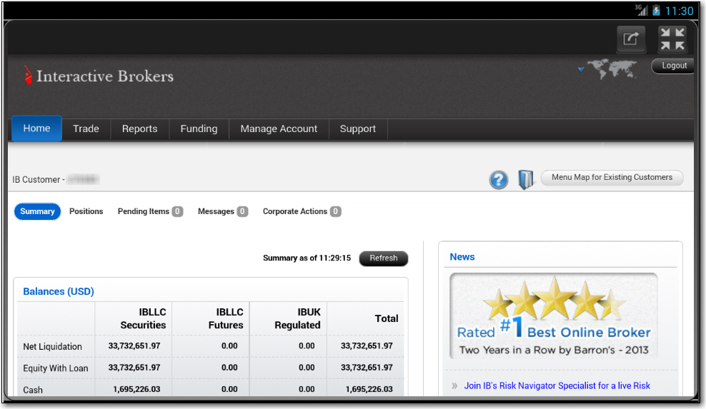 总结(Summary) - 实时总结信息按默认出现在主页上,包括当前余额、保证金要求和账户中可用于交易的资金,或在多账户结构情况下,所选取账户的信息。