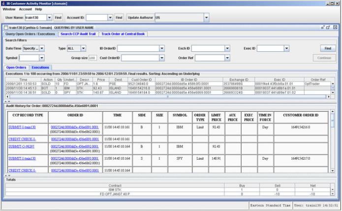 Real-time Queries: IB CAM communicates directly with the IB order routing system, which ensures real-time data results for order and execution queries. Flexible search filters let you narrow your queries to include specific criteria, and you can view search results in ascending or descending order by date, underlying, price, and so on.