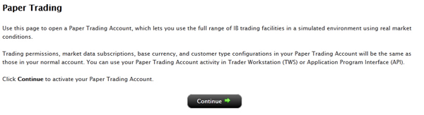 Once your regular trading account has been approved and funded, you are eligible to open a Paper Trading Account. All paper trading accounts start with 1,000,000 USD of paper trading equity, which allows you experiment with the full range of IB trading facilities in a simulated environment which uses real market conditions.