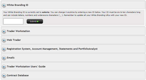 We provide Brokers with the ability to “White Brand” specific areas of our software and documentation. White Branding gives you the ability to display your own logos and company information on our trading platforms and reporting systems, including Trader Workstation, WebTrader, Account Management, statements, our registration system and the TWS Users’ Guide.