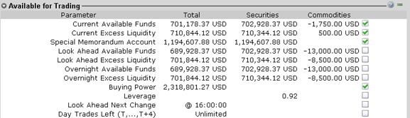 If you look at nothing else on the Account Screen, the Available for Trading values let you know the state of your account at a glance. Your Available Funds tells you if you can put on a trade. Your Excess Liquidity tells you whether you have sufficient cushion to maintain your current positions, and your Buying Power tells you how much you have at your disposal including your equity and IB's margin.